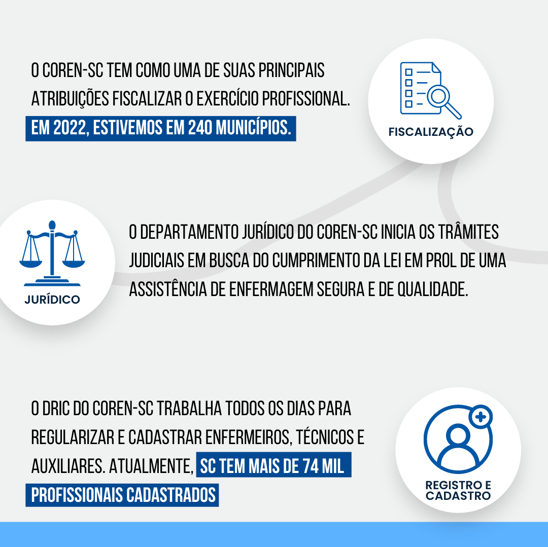 As ações realizadas pelo Coren/SC, incluindo a fiscalização do exercício profissional, capacitações, cursos e participação em ações de valorização da categoria podem ser acompanhadas através do site www.coren.sc.gov.br  e também nas redes sociais – Facebook, Instagram, Twitter, Telegram e YouTube.
