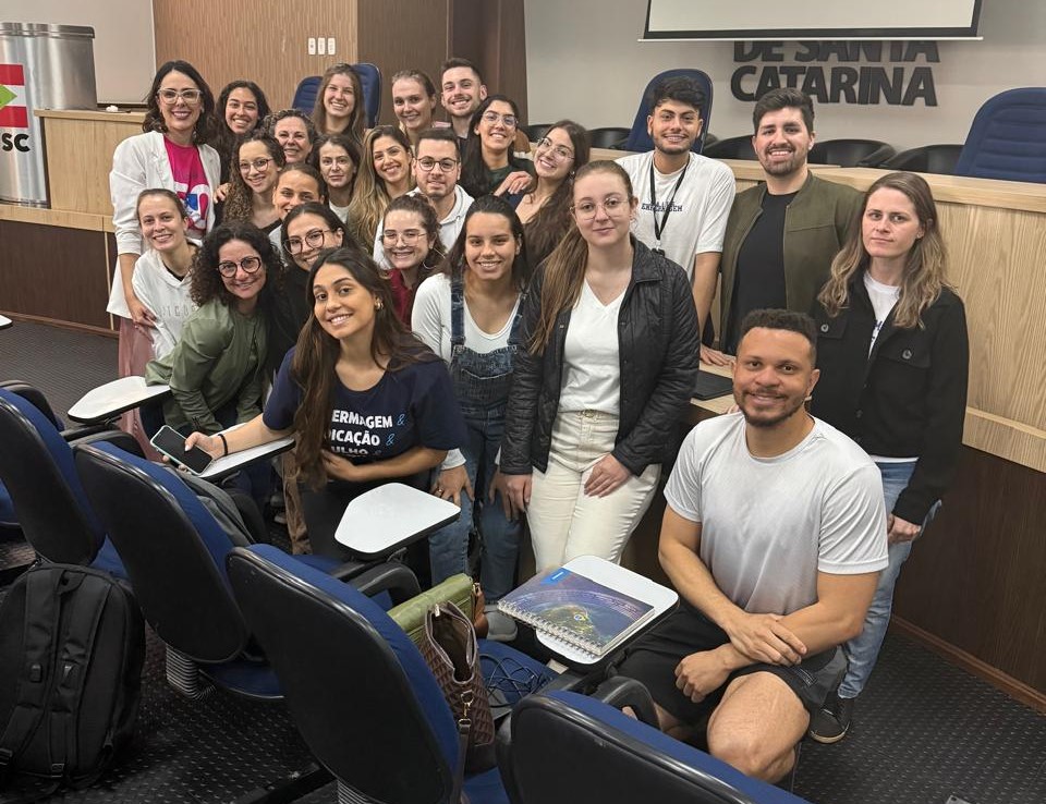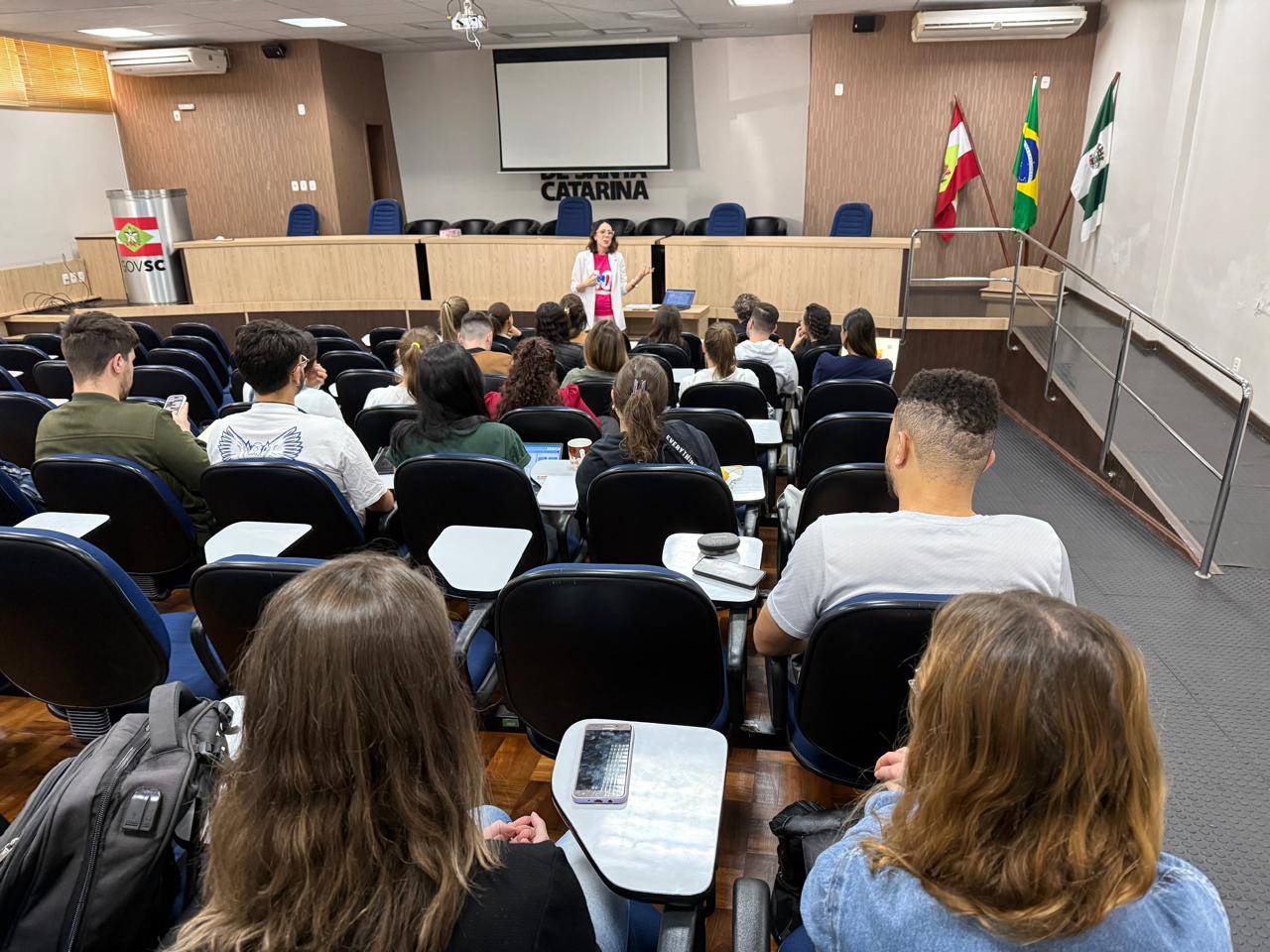 Poliana também orientou os alunos sobre o processo da primeira inscrição no Coren. A Conselheira, repassou informações preparadas pelo Departamento de Registro, Inscrição e Cadastro (DRIC) do Coren-SC. O Departamento, tem o intuito de facilitar o acesso dos novos profissionais ao conselho, e garantir que a transição da vida acadêmica para o mercado de trabalho seja tranquila e bem informada.