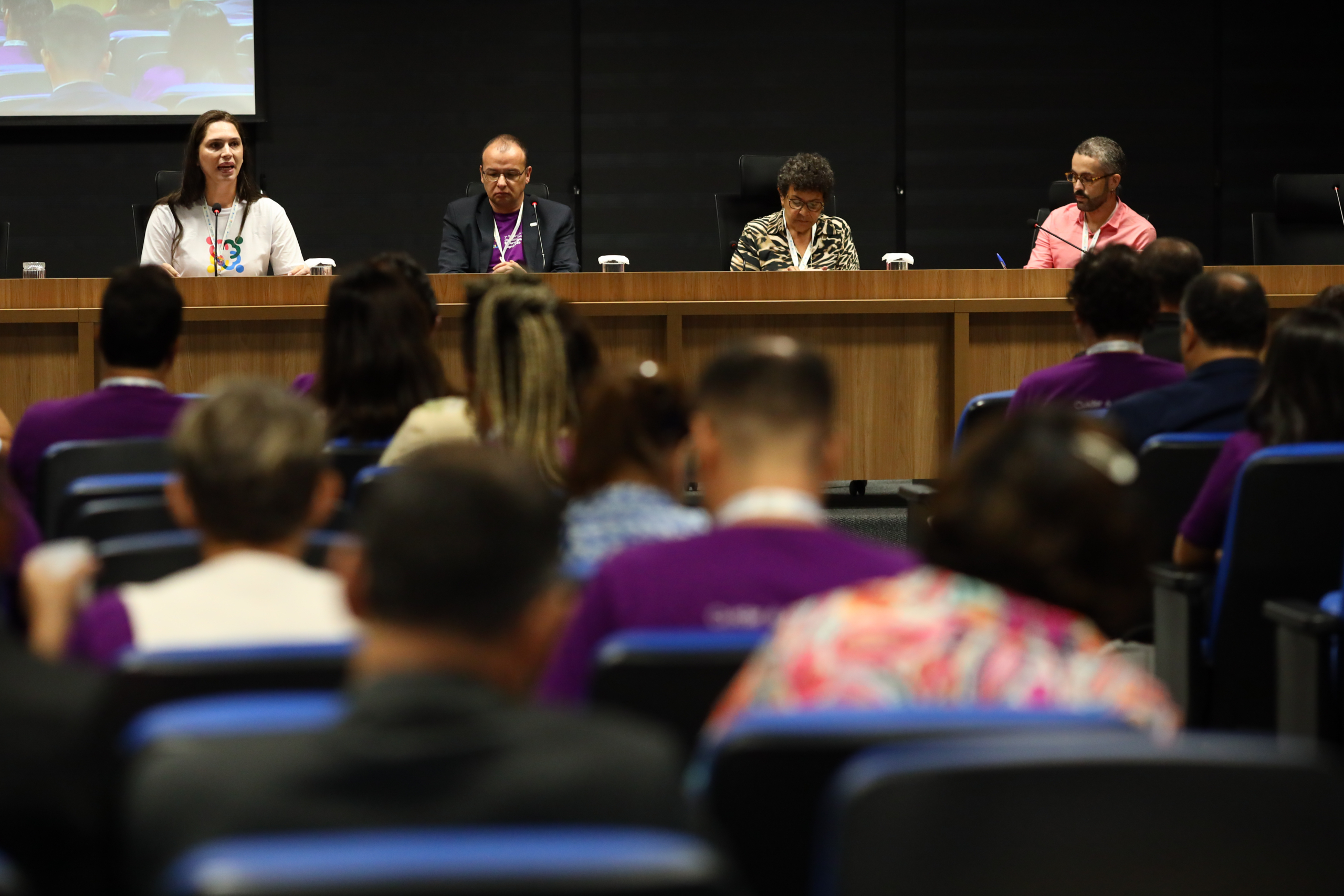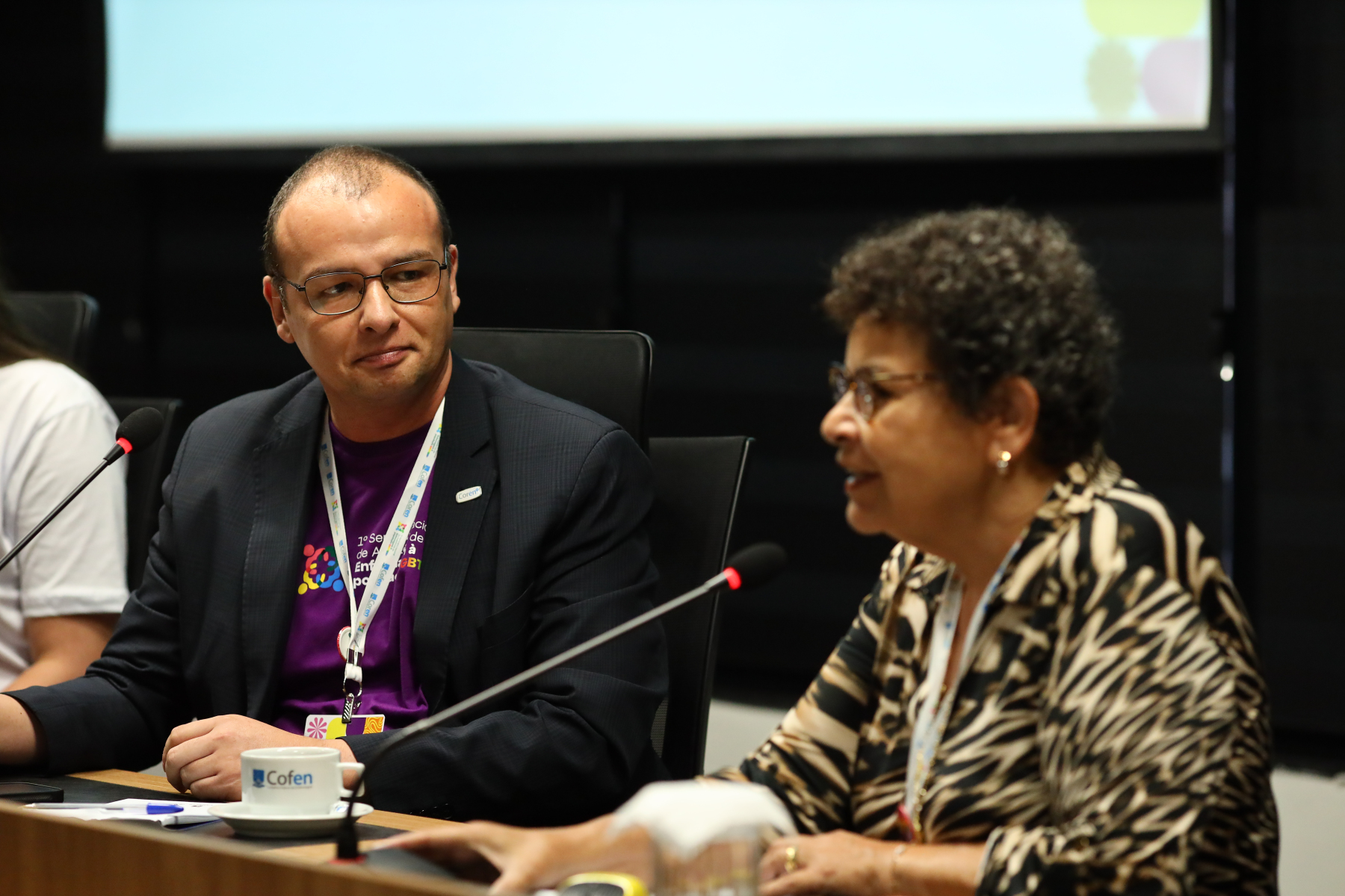 Em seguida, na mesa “Enfermagem em Defesa da Diversidade: Estratégias para Superar Preconceitos e Discriminações”, Helena Moraes, representante da Universidade Federal de Santa Catarina (UFSC), e Gilmara dos Santos, representante da Secretaria de Gestão do Trabalho e da Educação na Saúde do Ministério da Saúde (SGTES/MS), apresentaram fundamentos acadêmicos e institucionais para a construção de práticas antidiscriminatórias no cotidiano dos serviços de saúde. Destacou-se a importância da educação permanente, da atualização de fluxos assistenciais e do compromisso ético-profissional como instrumentos para assegurar atendimento respeitoso e qualificado. A mediação ficou por conta de Ivaldo da Silva, membro da Comissão Nacional de Auxiliares e Técnicos de Enfermagem do Cofen (CONATENF).