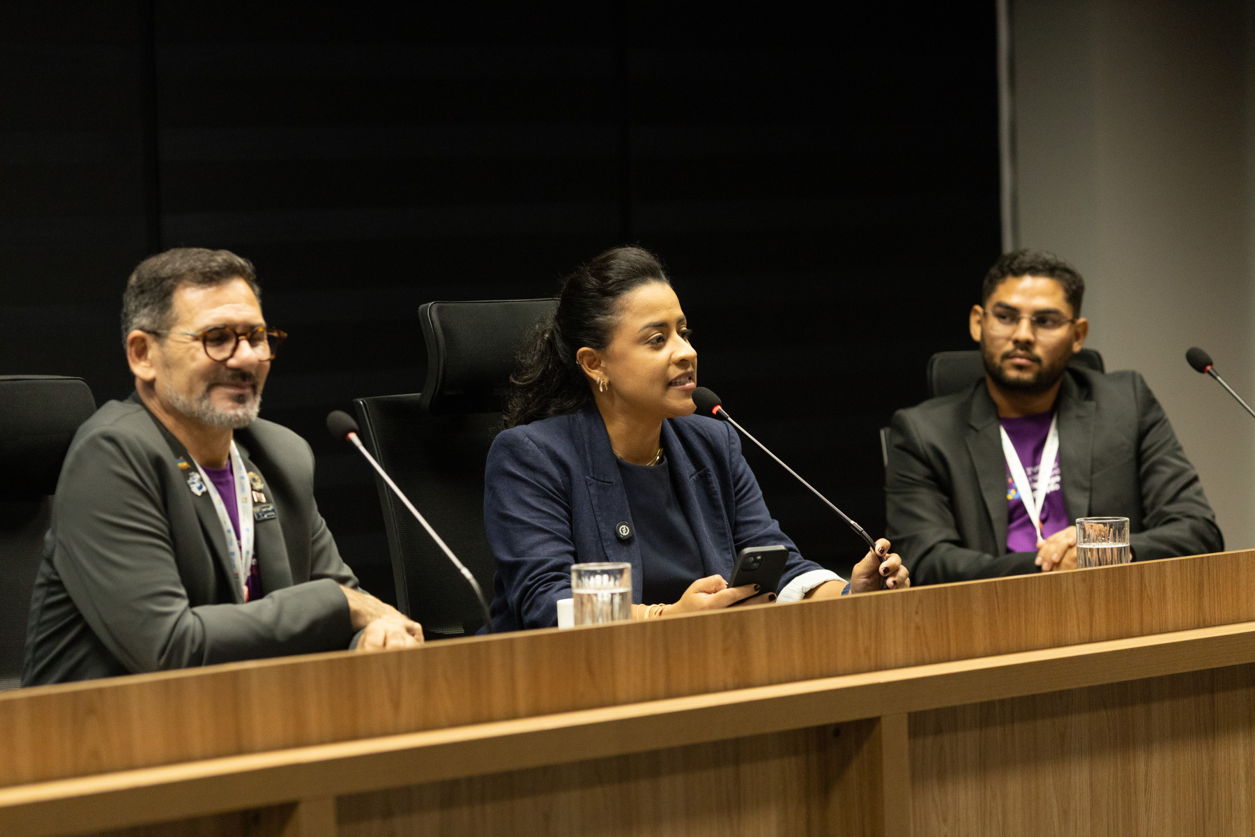 Na mesa “Panorama Atual da Enfermagem na Assistência à População LGBTQIA+: Desafios, Avanços e Perspectivas”, Rangel Fernandes, representante da Secretaria de Gestão do Trabalho e da Educação na Saúde do Ministério da Saúde (SGTES/MS); Márcio dos Santos, Márcio Bispo, conselheiro do Conselho Regional de Enfermagem de São Paulo (Coren-SP); e Yascarah da Silva, colaboradora do Conselho Regional de Enfermagem de Minas Gerais (Coren-MG), apresentaram um panorama da realidade brasileira. Foram debatidos entraves estruturais, como a persistência de práticas discriminatórias e lacunas na formação profissional, além dos avanços na normatização e na criação de câmaras técnicas dedicadas ao tema. A mediação foi conduzida por Solange Caetano, representante da Federação Nacional dos Enfermeiros (FNE).