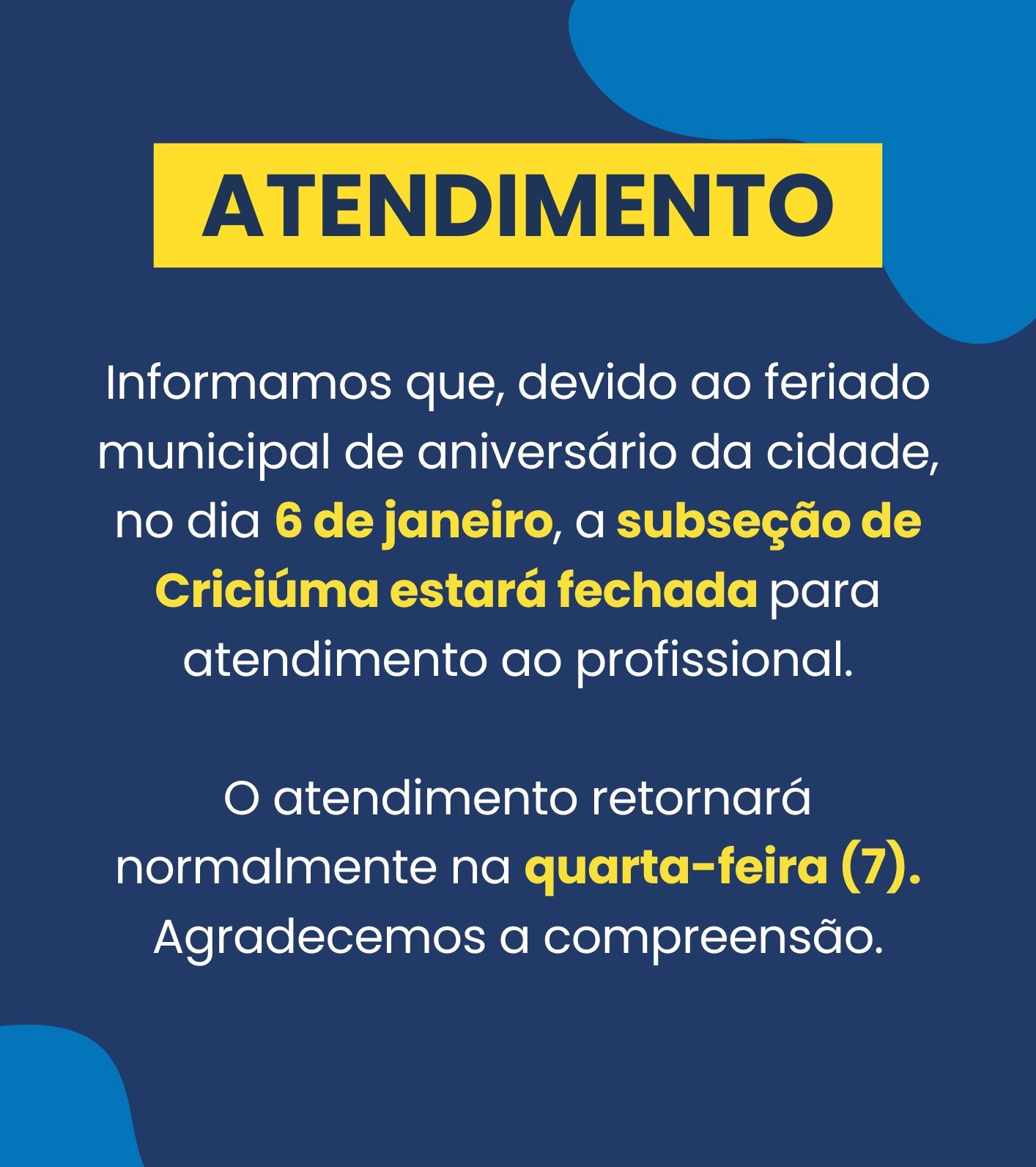 Informamos que, devido ao feriado municipal de aniversário da cidade, no dia 6 de janeiro, a subseção de Criciúma estará fechada para atendimento ao profissional.