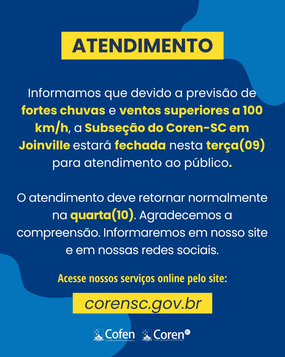 Informamos que devido a previsão de fortes chuvas e ventos superiores a 100 km/h, a Subseção do Coren-SC em Joinville estará fechada nesta terça (09 de dezembro de 2025) para atendimento ao público.